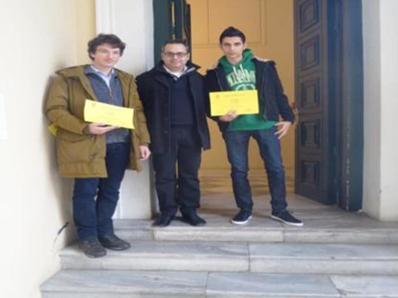 Επίσης, στους μαθητές μας Φραγκή Δημήτριο και Μπαχάρα Γρηγόριο απενεμήθηκε από την «Ένωση Ελλήνων Φυσικών» Έπαινος Συμμετοχής για την επίδοση τους στον 25ο Πανελλήνιο Διαγωνισμό Φυσικής Γυμνασίου.