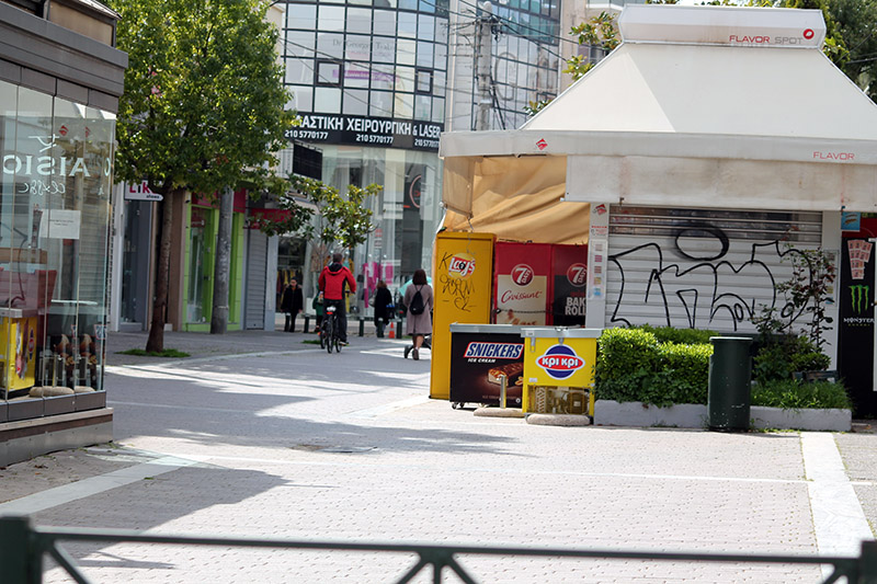 Σημεία που έσφυζαν από ζωή και κόσμο στο Περιστέρι μοιάζουν πολύ διαφορετικά εν μέσω απαγόρευσης κυκλοφορίας λόγω κορωνοϊού.