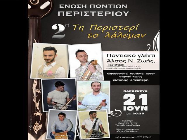 Το Διοικητικό Συμβούλιο της «Ένωσης Ποντίων Περιστερίου» διοργανώνει για δεύτερη συνεχή χρονιά το Ποντιακό Πανηγύρι «Τη Περιστερί το λάλεμαν», την Παρασκευή 21 Ιουνίου 2013 και ώρα 8.30, στο Πάρκο Ν. Ζωής.