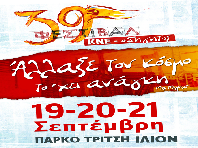 Στις 19-20-21 Σεπτέμβρη στο Πάρκο Τρίτση στο Ίλιον θα πραγματοποιηθεί φέτος το 39ο Φεστιβάλ ΚΝΕ- Οδηγητή. Το Σάββατο 21 Σεπτέμβρη στο χώρο του Φεστιβάλ θα μιλήσει ο Δημήτρης Κουτσούμπας, ΓΓ της ΚΕ του ΚΚΕ ενώ χαιρετισμό θα απευθύνει ο Θοδωρής Χιώνης, Γραμματέας του ΚΣ της ΚΝΕ.