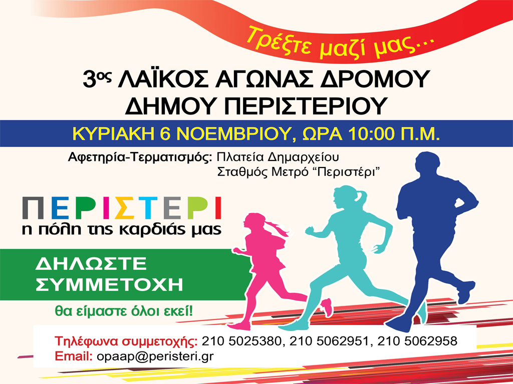 Την Κυριακή 6 Νοεμβρίου 2016 στις 10:00 το πρωί θα πραγματοποιηθεί ο 3ος Λαϊκός Αγώνας Δρόμου του Δήμου Περιστερίου, 1.000 μέτρων για τα παιδιά και 10,2 χιλιομέτρων για τους μεγάλους, με αφετηρία και τερματισμό την πλατεία Δημαρχείου (σταθμός Μετρό «Περιστέρι»).