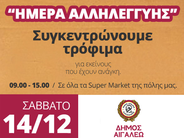 Η Κοινωνική Υπηρεσία του Δήμου Αιγάλεω, ενόψει και των εορτών των Χριστουγέννων, διοργανώνει το Σάββατο 14 Δεκεμβρίου 2013 από 09.00 π.μ. – 15.00. μ.μ στα Super Market της πόλης μας, την 5η «ΗΜΕΡΑ ΑΛΛΗΛΕΓΓΥΗΣ» με σκοπό τη συγκέντρωση τροφίμων και ειδών πρώτης ανάγκης για το Κοινωνικό Παντοπωλείο του Δήμου.