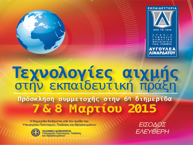 Τα Εκπαιδευτήρια Αυγουλέα-Λιναρδάτου για 6η συνεχή χρονιά και υπό την αιγίδα του Υπουργείου Πολιτισμού, Παιδείας & Θρησκευμάτων, πραγματοποιούν την ιδιαίτερα επιτυχημένη διημερίδα «Τεχνολογίες αιχμής στην εκπαιδευτική πράξη»η οποία θα λάβει χώρα στις 7 &8 Μαρτίου 2015, στις εγκαταστάσεις των εκπαιδευτηρίων στο Περιστέρι(Ελευθερίου Βενιζέλου 112-114).