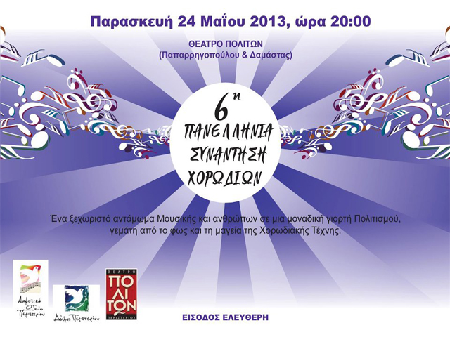 Το Δημοτικό Ωδείο Περιστερίου σας προσκαλεί την Παρασκευή 24 Μαΐου 2013, ώρα 20:00 στο θέατρο Πολιτών (Παπαρηγοπούλου & Δαμάστας, Περιστέρι) στην «6η Πανελλήνια Συνάντηση Χορωδιών», που αποτελεί για την πόλη μας θεσμό καλλιτεχνικής έκφρασης και δημιουργίας.