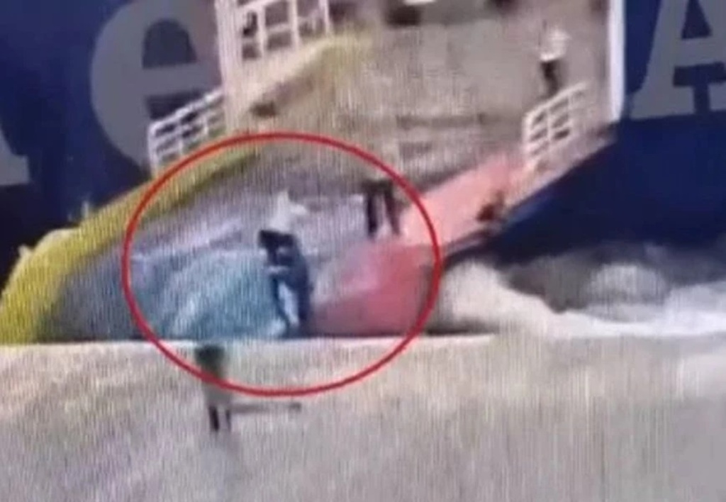Ο άντρας χάνει την ισορροπία του και πέφτει στη θάλασσα, στα απόνερα των κύριων μηχανών του μεγάλου επιβατηγού οχηματαγωγού που έχουν τεθεί σε λειτουργία για τον απόπλου.