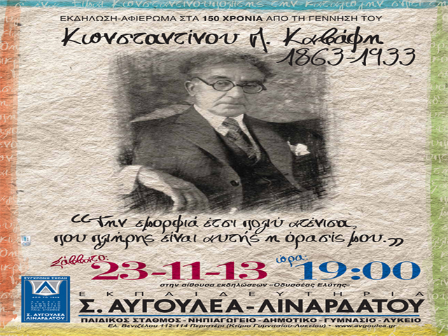 Tα εκπαιδευτήρια Σ. Αυγουλέα-Λιναρδάτου τιμούν τον, διεθνώς αναγνωρισμένο, Έλληνα ποιητή με μια θεατρική και μουσική εκδήλωση, το Σάββατο, 23 Νοεμβρίου, στις 19:00, στην αίθουσα εκδηλώσεων του σχολείου «Οδυσσέας Ελύτης». Στην εκδήλωση μαθητές του σχολείου με απαγγελία και μουσική, παρουσιάζουν τον καβαφικό λόγο και αναδεικνύουν τη διαχρονικότητά του.