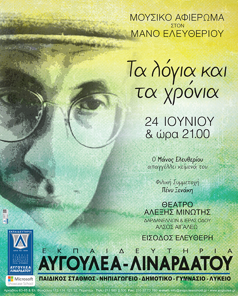 Tα Εκπαιδευτήρια Αυγουλέα-Λιναρδάτου την Παρασκευή 24 Ιουνίου 2016 & ώρα 21.00 τιμούν σ’ ένα μεγάλο μουσικό αφιέρωμα, στο θέατρο «Αλέξης Μινωτής», τον κορυφαίο δημιουργό του «Άγιου Φεβρουάριου» και της «Θητείας», τον μεγάλο έλληνα ποιητή, στιχουργό και πεζογράφο Μάνο Ελευθερίου.