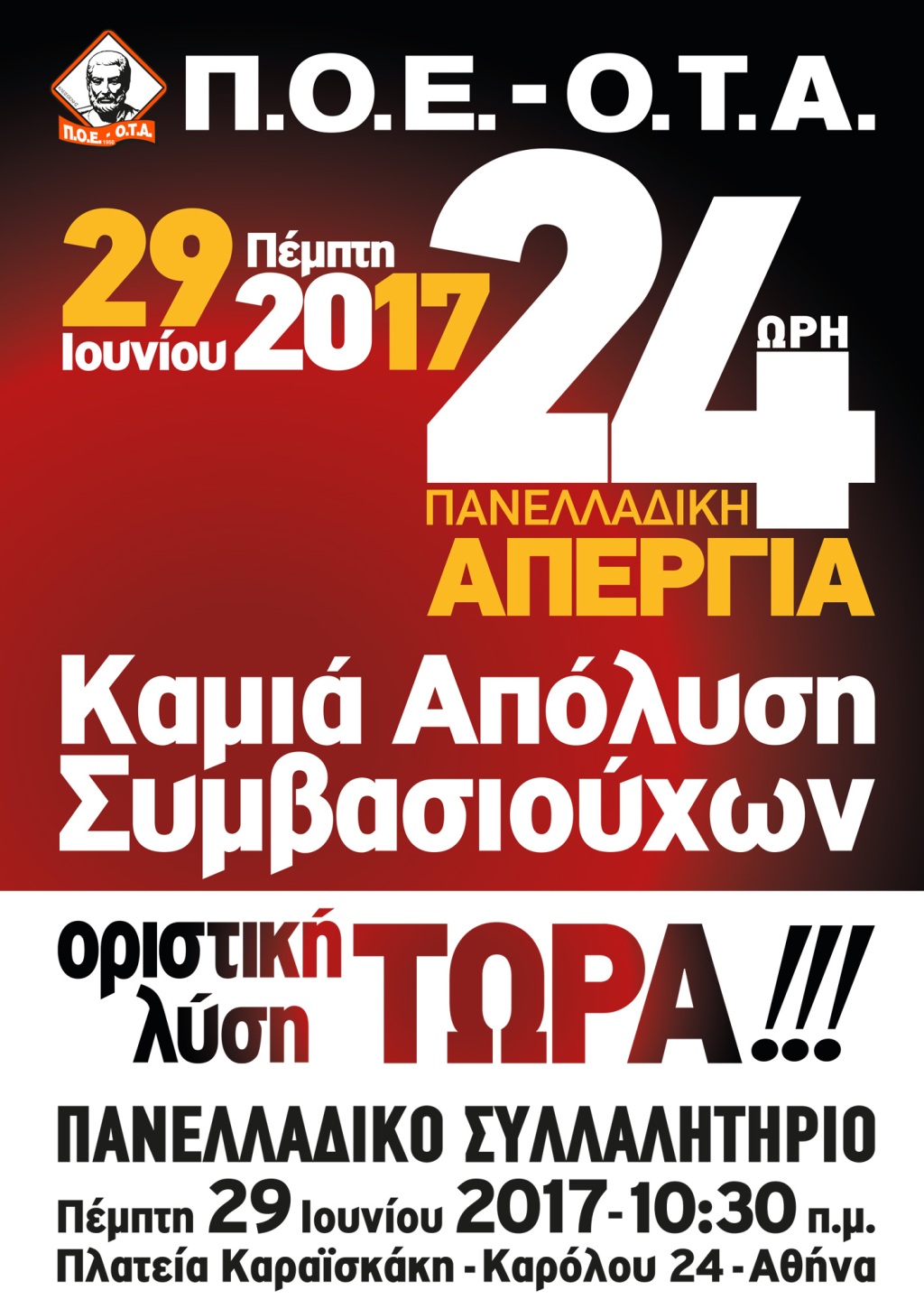Η αφίσα της εκτελεστικής επιτροπής της Π.Ο.Ε.-Ο.Τ.Α. για την 24ωρη πανελλαδική απεργία των εργαζομένων στην τοπική αυτοδιοίκηση την Πέμπτη 29 Ιουνίου 2017 για να μην υπάρξει καμία απόλυση συμβασιούχων και να δοθεί οριστική λύση τώρα.