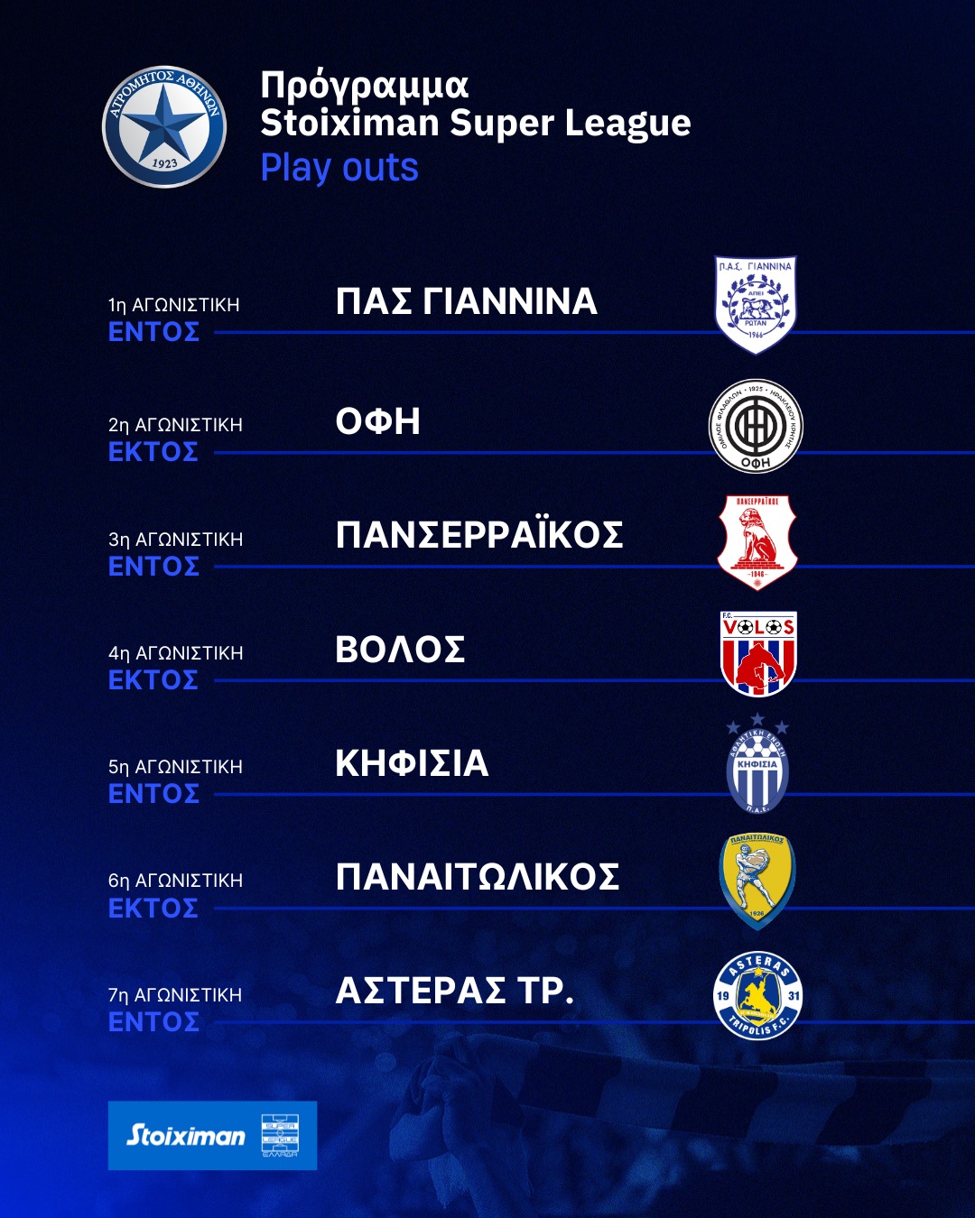 Η πρεμιέρα θα πραγματοποιηθεί στο Δημοτικό Στάδιο Περιστερίου Ατρόμητος – Άγγελος Ράμφος κόντρα στον ΠΑΣ Γιάννινα, ενώ το φινάλε θα είναι επίσης εντός έδρας κόντρα στον Αστέρα Τρίπολης.
