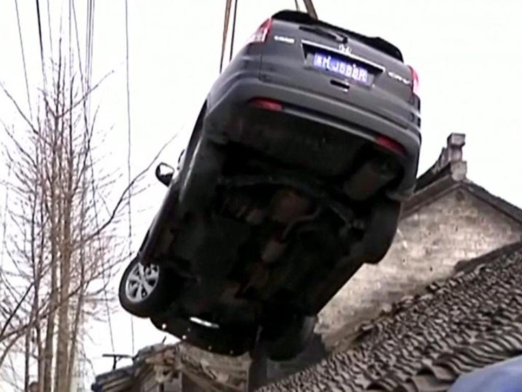 Στην οροφή ενός σπιτιού ολοκληρώθηκε η τρελή πορεία ενός αυτοκινήτου, στην πόλη Ταϊσού της επαρχίας Τσιανγκσού, στην ανατολική Κίνα, χωρίς ευτυχώς να τραυματιστεί κανείς.