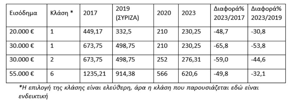 Ακολουθούν ενδεικτικά παραδείγματα για το ύψος των εισφορών μη μισθωτών, όπως διαμορφώθηκαν επί ΣΥΡΙΖΑ με το νόμο Κατρούγκαλου, το 2020 με το νόμο Βρούτση και το 2023.