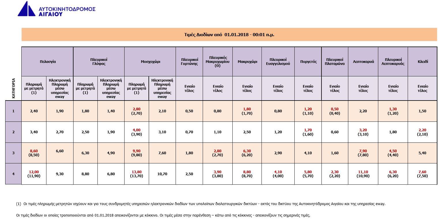 Αυξάνονται από την 1η Ιανουαρίου του 2018 τα διόδια στη διαδρομή από Πελασγία έως Κλειδί της Εθνικής Οδού Αθήνας – Θεσσαλονίκης, καθώς οι τιμές θα αναπροσαρμοστούν προς τα πάνω για 10 λεπτά ανά διέλευση σε 10 από τους 12 σταθμούς που διαχειρίζεται ο Αυτοκινητόδρομος Αιγαίου.