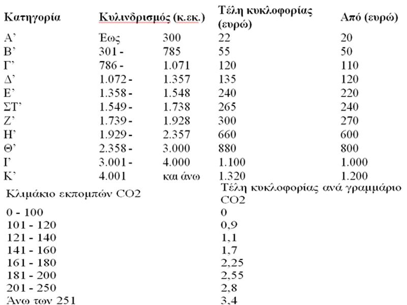 Για τα επιβατικά αυτοκίνητα που έχουν ταξινομηθεί για πρώτη φορά στην Ελλάδα έως την 31 Οκτωβρίου 2010 και τις μοτοσικλέτες, ανεξαρτήτως ημερομηνίας πρώτης ταξινόμησης, ισχύουν με βάση τον κυλινδρισμό: