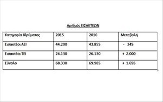 Αυξάνονται κατά 1.655 οι θέσεις στα τμήματα της τριτοβάμιας εκπαίδευσης για το ακαδημαϊκό έτος 2016 – 17 και οι εισακτέοι θα ανέλθουν σε 69.985 άτομα.