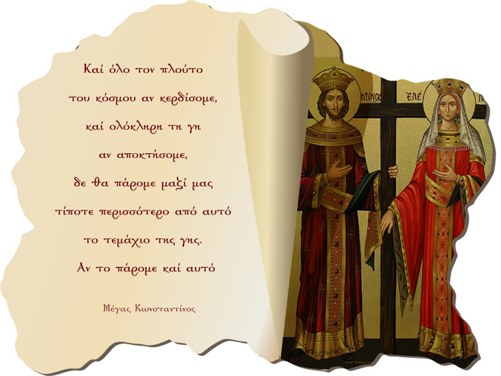 Το 328 ο Κωνσταντίνος, έθεσε στο Βυζάντιο τα θεμέλια της Κωνσταντινούπολης ως πρωτεύουσας. Η μητέρα του Ελένη, αφού βρήκε τον Τίμιο Σταυρό χώρισε τα δύο κομμάτια του και δημιούργησε δύο Σταυρούς εκ των οποίων τον ένα τον μετέφερε στην Κωνσταντινούπολη. Ο γιός της για να την τιμήσει, έκτισε στη μεγάλη πλατεία της Κωνσταντινούπολης δυο στήλες, μία δική του και μία της Αγίας Ελένης, που έφερε την επιγραφή: “Εις Άγιος εις Κύριος Ιησούς Χριστός, εις δόξαν Θεού Πατρός, Αμήν”.