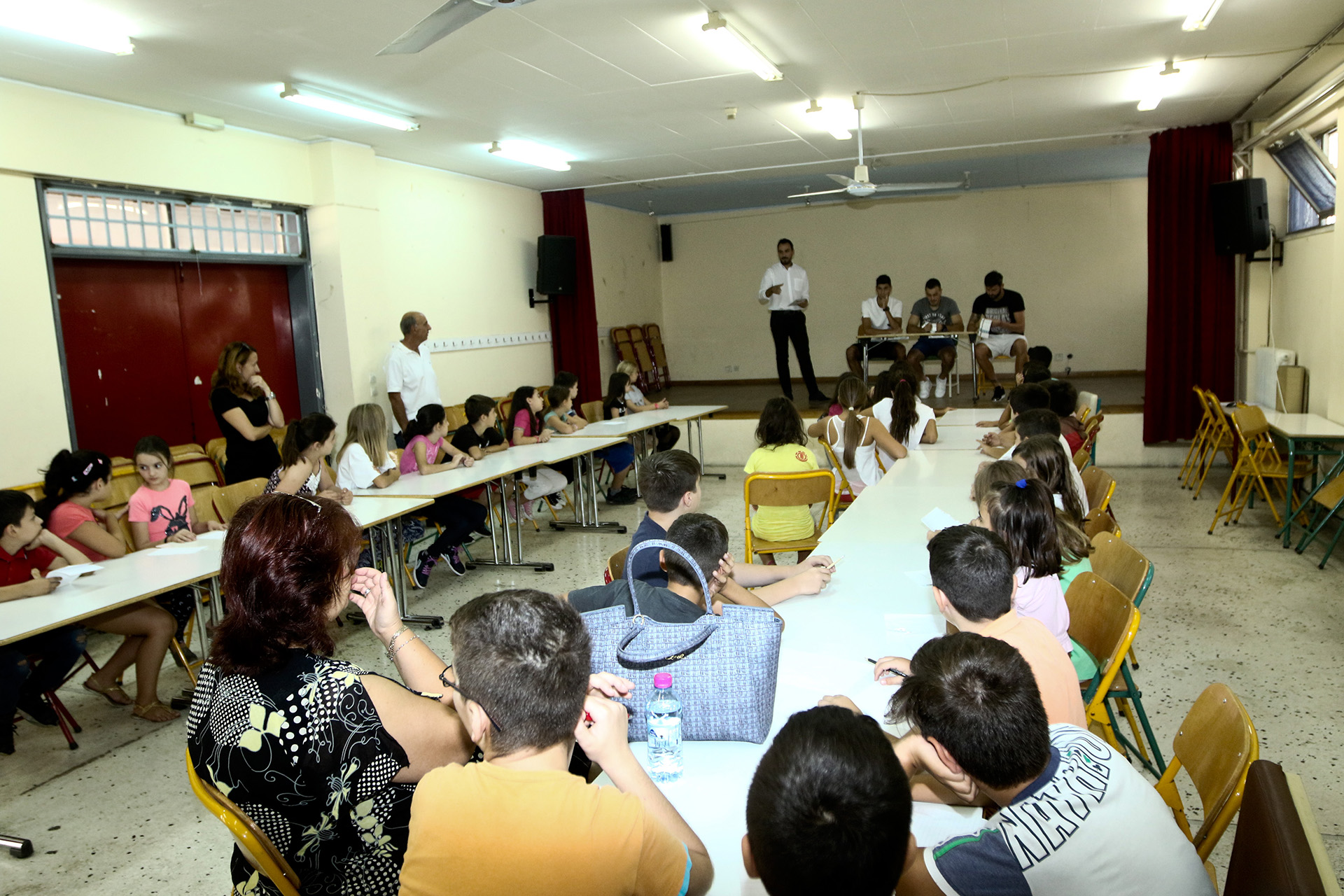 Οι ποδοσφαιριστές μας Παύλος Κυριακίδης, Nikola Mirkovic και Μιχάλης Μπαστακός συνομίλησαν με τους μικρούς μαθητές πάνω σε ποδοσφαιρικά θέματα για αρκετή ώρα, τους υπέγραψαν αυτόγραφα και τους προσκάλεσαν στον αυριανό αγώνα που θα διεξαχθεί στο δημοτικό στάδιο Περιστερίου στις 18.15.