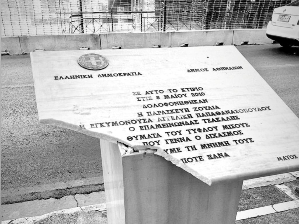 Άγνωστοι βανδάλισαν την Τρίτη τη μαρμάρινη πλακέτα η οποία είναι αφιερωμένη στα θύματα της τραγωδίας της Marfin στη Σταδίου.