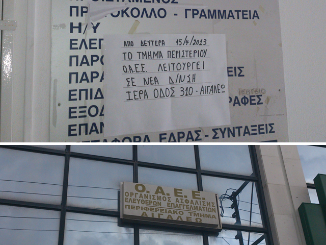 Από τη Δευτέρα 15 Απριλίου ο ΟΑΕΕ στο Περιστέρι μεταφέρθηκε στο τμήμα Αιγάλεω(Ιερά Οδός 310).