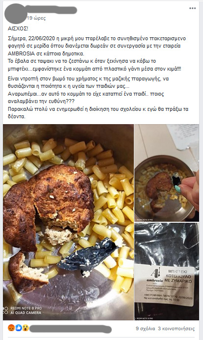Όπως αναφέρει η μητέρα παιδιού από το 3ο δημοτικό σχολείο Αγίων Αναργύρων, στο δωρεάν σχολικό γεύμα που δόθηκε στην κόρη της τη Δευτέρα 22.6.2020 βρήκε μέσα ένα κομμάτι από πλαστικό γάντι.