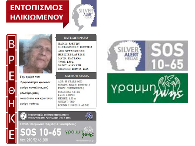 Συγκεκριμένα, η ηλικιωμένη εξαφανίστηκε το πρωί της 10/09/2013 από την οικία της στη Χρυσούπολη, όταν έφυγε για να επισκεφθεί συγγενικό της πρόσωπο. Η ΓΡΑΜΜΗ ΖΩΗΣ, με τη συγκέντρωση των απαραίτητων δικαιολογητικών, την 11/09/2013 ενεργοποίησε το SILVER ALERT. Η Κοινωνική Υπηρεσία της Οργάνωσης δέχθηκε το βράδυ της Τετάρτης 11/09/2013, κλήση, για την ανεύρεσή της. Πολίτης, που είδε το SILVER ALERT, αναγνώρισε την ηλικιωμένη περιπλανώμενη και ειδοποίησε το Α.Τ. Περιστερίου. Η 83χρονη, είναι καλά στην υγεία της και βρίσκεται κοντά στα οικεία της πρόσωπα.