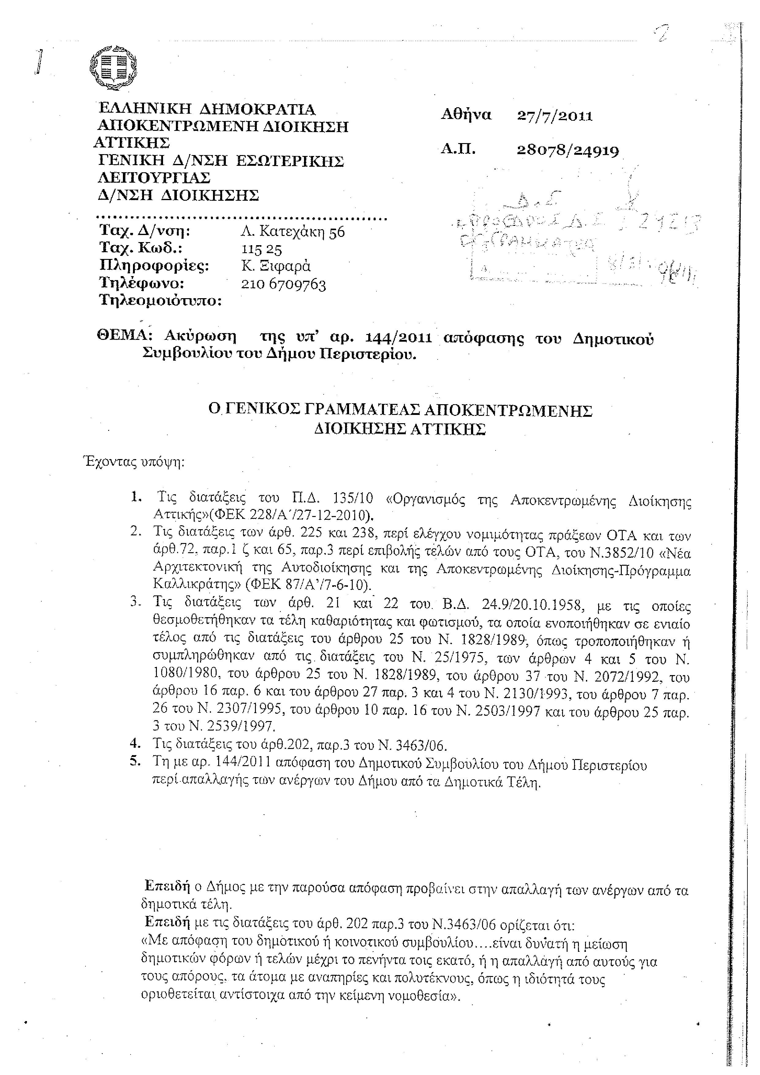 Με απόφαση της Αποκεντρωμένης Διοίκησης Αττικής του Υπουργείου Εσωτερικών