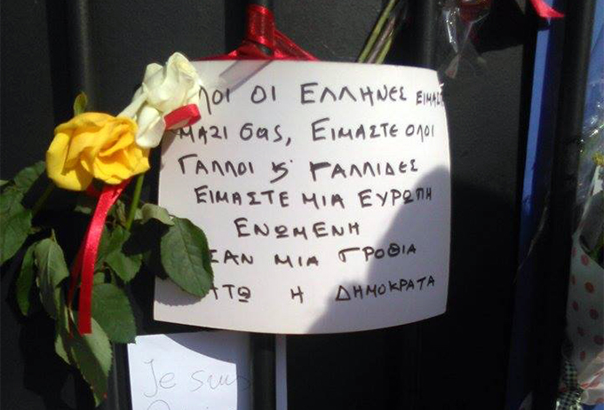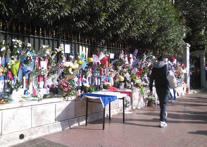 Τη συμπαράστασή τους στους πολίτες της Γαλλίας για τις επιθέσεις στο Παρίσι εξέφρασαν εκατοντάδες Έλληνες που άφησαν λουλούδια και σημειώματα στη γαλλική πρεσβεία, επί της Βασιλίσσης Σοφίας, στη μνήμη των θυμάτων από τις τρομοκρατικές επιθέσεις.