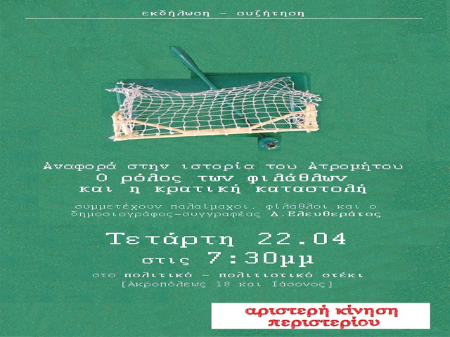 Η Αριστερή Κίνηση Περιστερίου σας προσκαλεί στην εκδήλωση – συζήτηση που διοργανώνει την Τετάρτη 22 Απριλίου στις 7:30μμ στο πολιτικό – πολιτιστικό στέκι της [Ακροπόλεως 18 και Ιάσονος] με θέμα: “Αναφορά στην ιστορία του Ατρόμητου – Ο ρόλος των φιλάθλων και η κρατική καταστολή”.