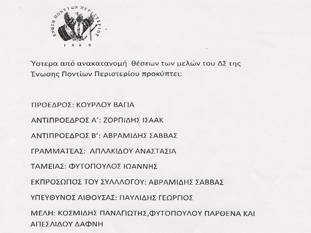 Ύστερα από ανακατανομή των μελών του ΔΣ της Ένωσης Ποντίων Περιστερίου προκύπτει :