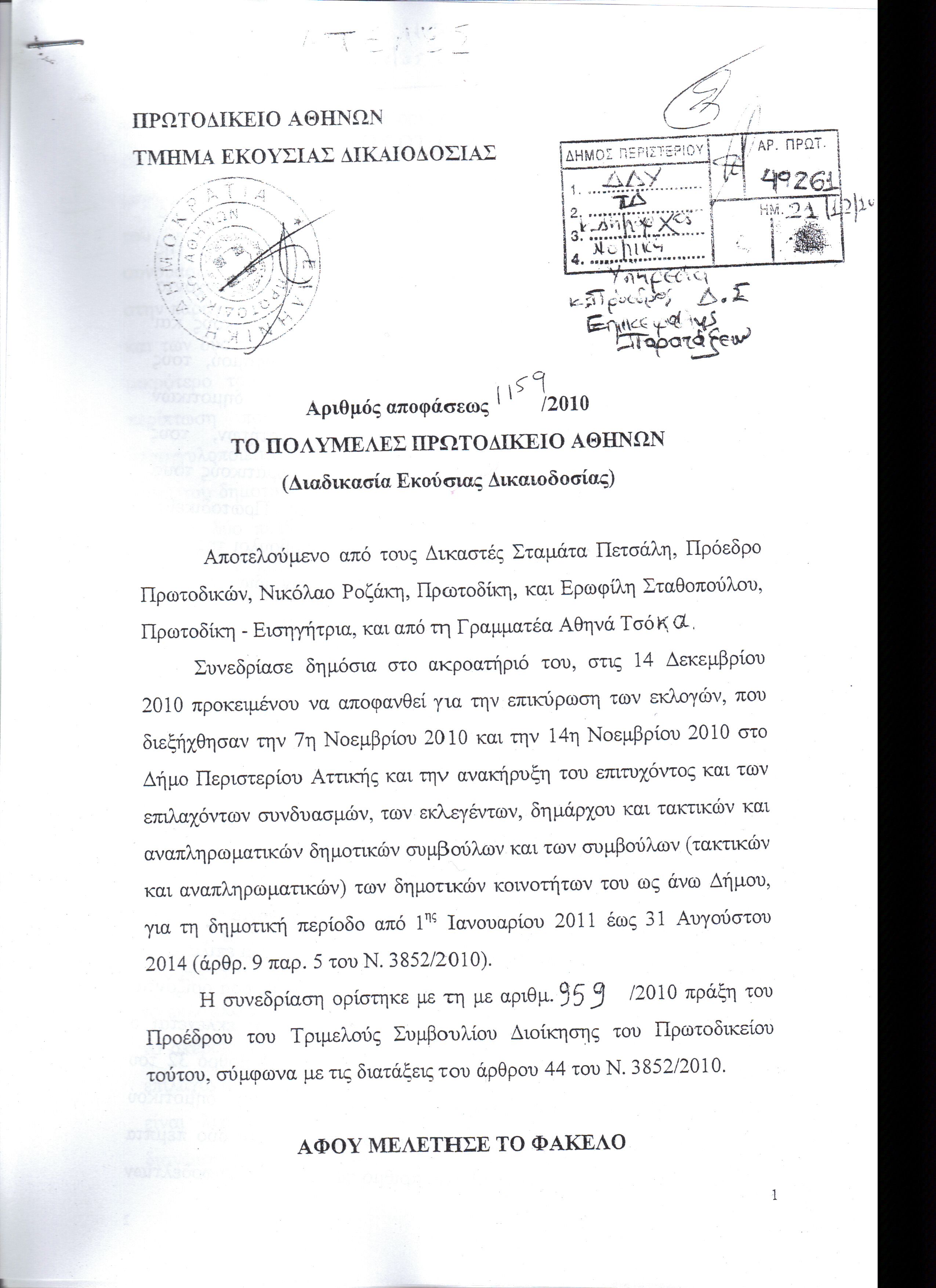 Κρίθηκε στις 14 Δεκεμβρίου 2010 και δημοσιεύθηκε σε έκτακτη δημόσια συνεδρίαση στο ακροατήριο στην Αθήνα στις 20 Δεκεμβρίου και ακολούθησε σήμερα η κοινοποίηση και ανάρτηση στο Δήμο Περιστερίου.