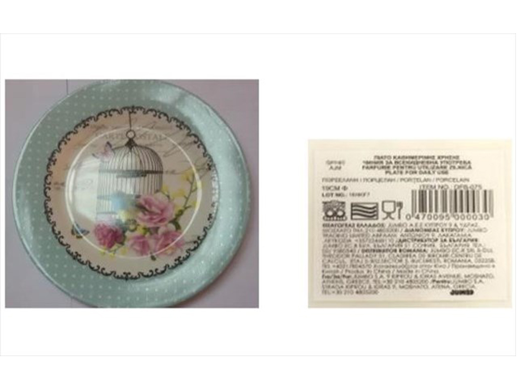 Πρόκειται για πιάτο καθημερινής χρήσης από πορσελάνη με διάμετρο 19cm, προέλευσης Κίνας, με κωδικό προϊόντος ITEMNO.:DFB-075, αριθμό παρτίδας 16HKF7 και αριθμό γραμμοκώδικα 0470095000030, το οποίο διατέθηκε από την εταιρεία «Jumbo A.Ε.Ε.».