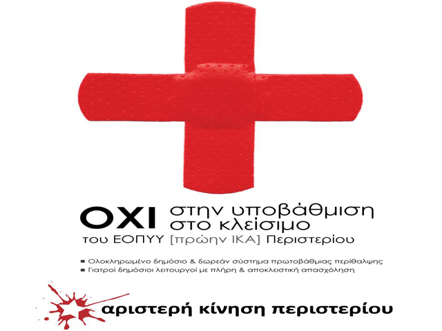 Με αφορμή τις απεργιακές κινητοποιήσεις των εργαζομένων του ΕΟΠΥΥ Περιστερίου και των άλλων περιοχών ενάντια στην υποβάθμιση και σταδιακό κλείσιμο των μονάδων Υγείας.