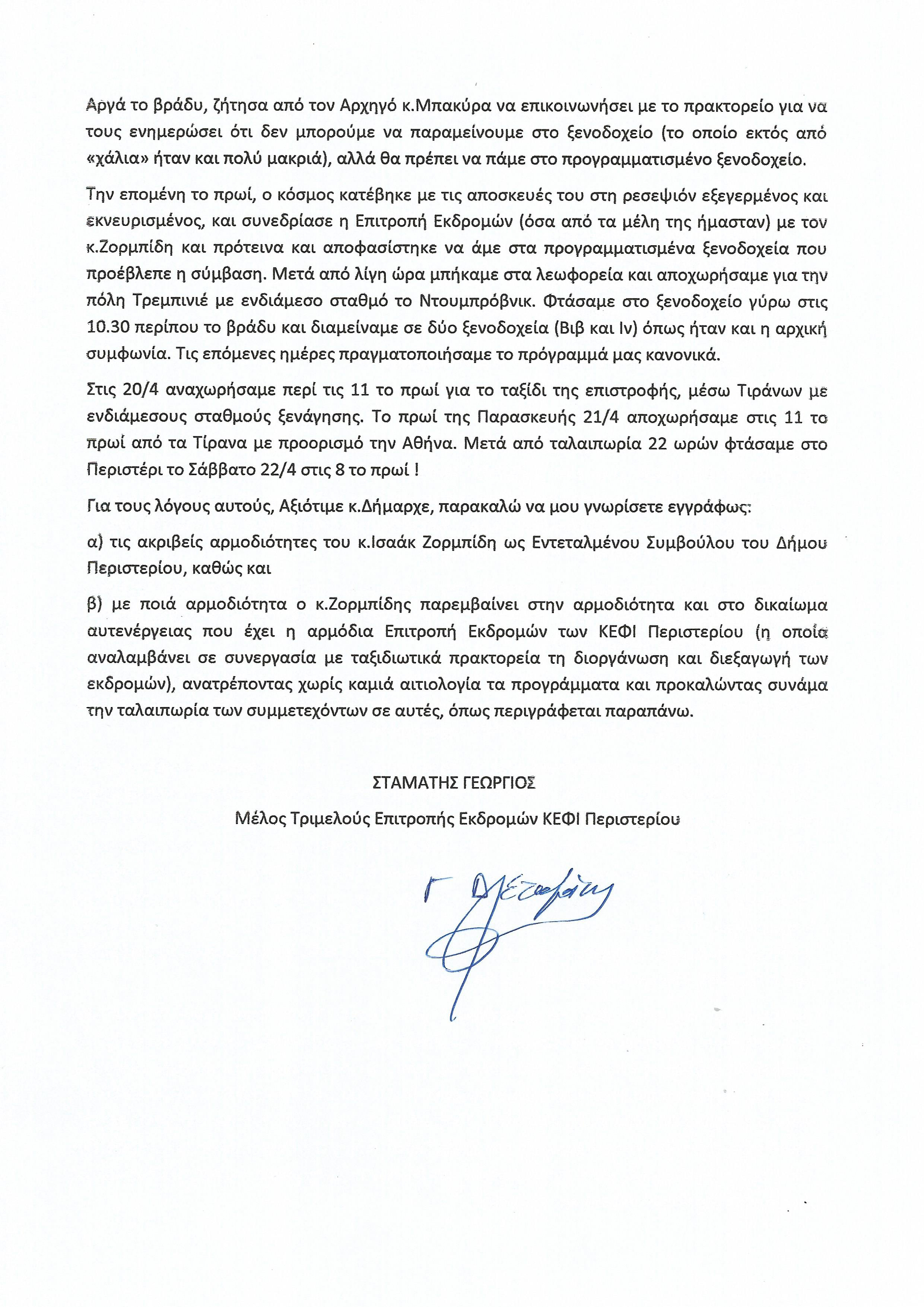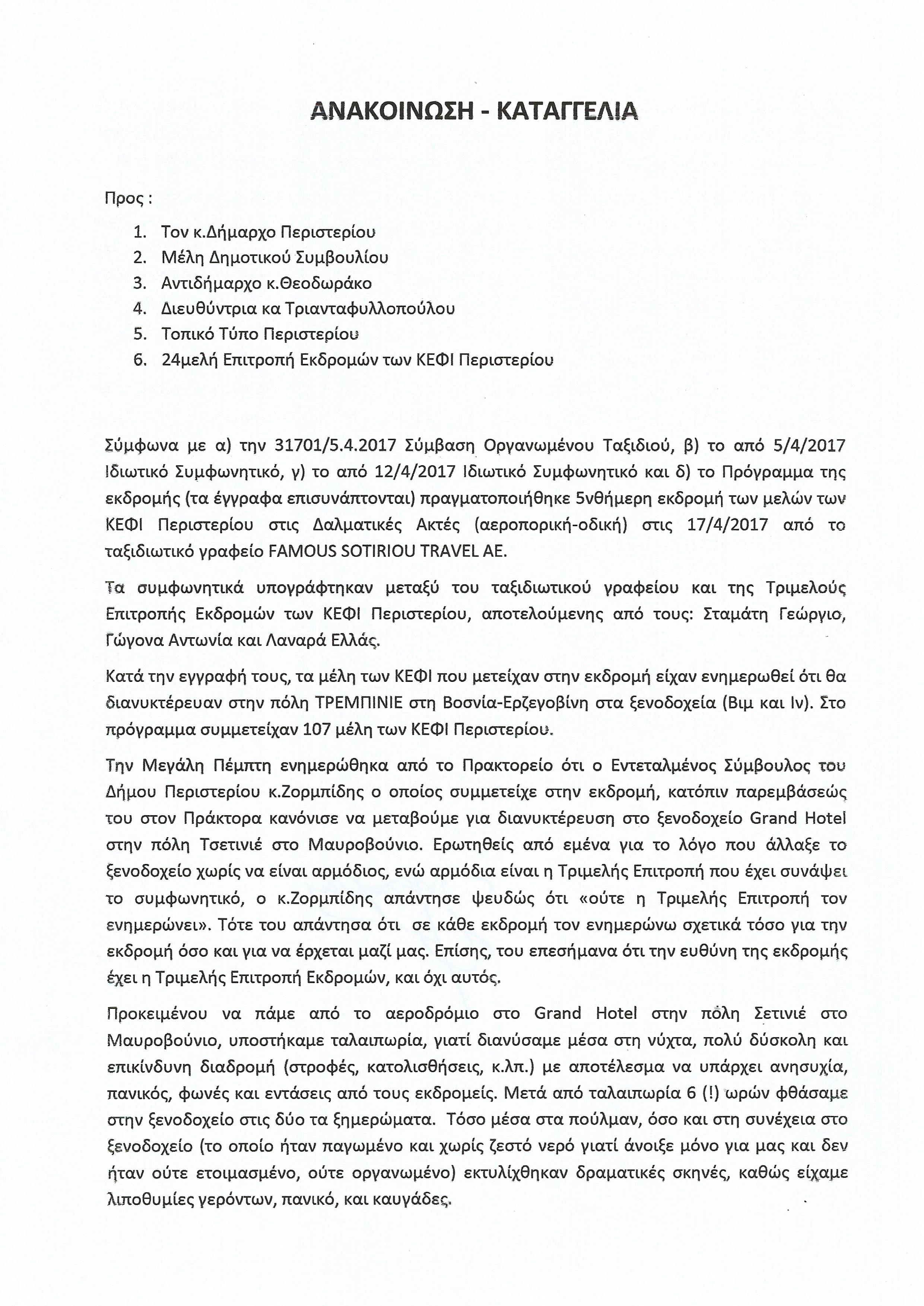 Ανακοίνωση-καταγγελία προς τα τοπικά μέσα ενημέρωσης σχετικά με εκδρομή των ΚΕΦΙ Περιστερίου έστειλε το μέλος της τριμελούς επιτροπής εκδρομών ΚΕΦΙ Περιστερίου, κ. Γεώργιος Σταμάτης. Αναλυτικά: