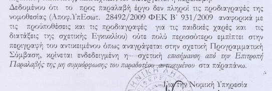 Τελικά, η νομική υπηρεσία της περιφέρειας, αποφαίνεται ότι «…το προς παραλαβή έργο δεν πληροί τις προδιαγραφές της νομοθεσίας αναφορικά με τις προϋποθέσεις και προδιαγραφές για τις παιδικές χαρές…ούτε πολύ περισσότερο εμπίπτει στην περιγραφή του αντικειμένου όπως αναγράφεται στη σχετική προγραμματική σύμβαση…».