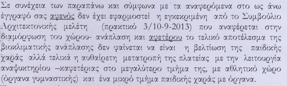 Ανεξάρτητα όμως, από τις ακολουθούμενες μεθοδεύσεις του κ.Παχατουρίδη για εξυπηρέτηση ιδίου πολιτικού οφέλους ή όποιου άλλου, η νομική υπηρεσία, της περιφέρειας αποφαίνεται ότι «…το τελικό αποτέλεσμα της βιοκληματικής ανάπλασης δεν φαίνεται να είναι η βελτίωση της παιδικής χαράς, αλλά τελικά η αυθαίρετη μετατροπή της πλατείας με την λειτουργία αναψυκτηρίου-καφετέριας στο μεγαλύτερο τμήμα της, με αθλητικό χώρο (όργανα γυμναστικής) και ένα μικρό τμήμα παιδικής χαράς με όργανα.», όπως φαίνεται παρακάτω στο έγγραφο της νομικής υπηρεσίας.