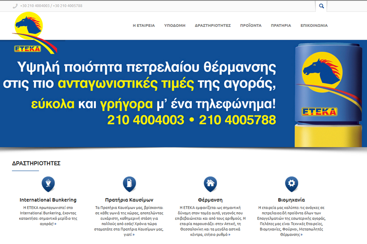 Στον «αέρα» του διαδικτύου έχει ανέβει εδώ και μερικές μέρες το νέο, ανανεωμένο και λειτουργικό site της πετρελαϊκής εταιρείας, ETEKA, η οποία πλέον θεωρείται από τις μεγαλύτερες στο χώρο εταιρείες διάθεσης καυσίμων στην Ελλάδα και όχι μόνο.