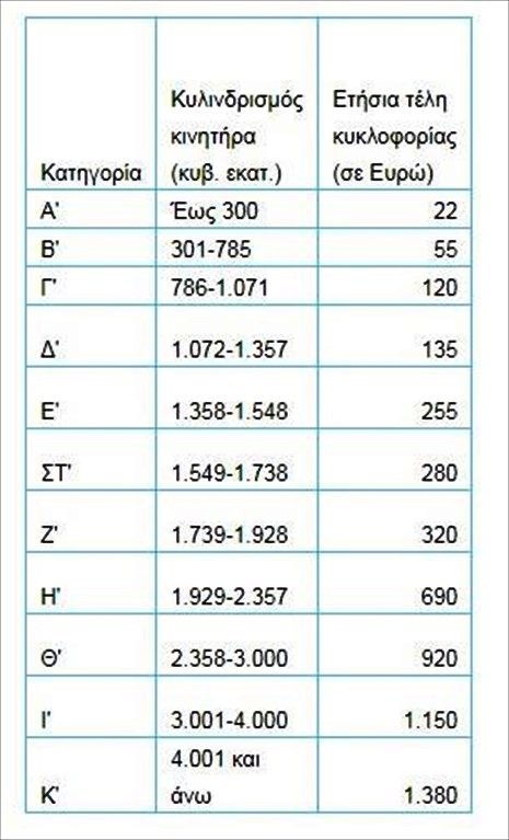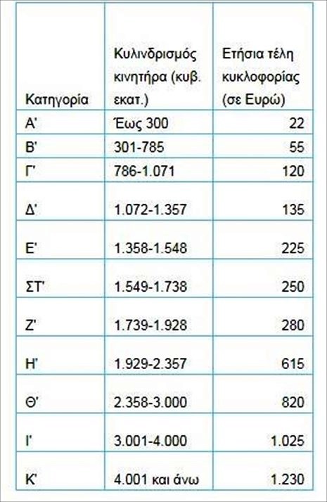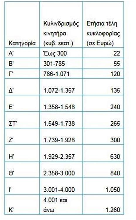 Για τις τρεις πρώτες, κριτήριο είναι ο κυβισμός και το έτος πρώτης κυκλοφορίας ενώ για την τέταρτη, είναι οι εκπομπές αερίων ρύπων.