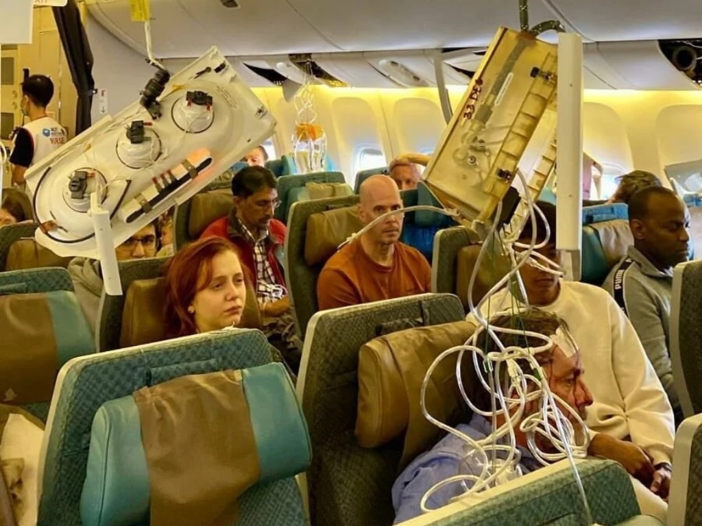 Εικόνες που δημοσιεύθηκαν στα κοινωνικά δίκτυα αποκαλύπτουν τον τρόμο από τις αναταράξεις που έζησαν οι 230 επιβαίνοντες στο αεροσκάφος της Singapore Airlines, το οποίο πέφτοντας σε κενό αέρος, πάνω από τον κόλπο του Μαρταμπάν στη Μιανμάρ, έκανε επί τρία λεπτά μία ελεύθερη πτώση 6.000 ποδιών, με αποτέλεσμα ένας άνθρωπος να σκοτωθεί και πάνω από 20 να τραυματιστούν.