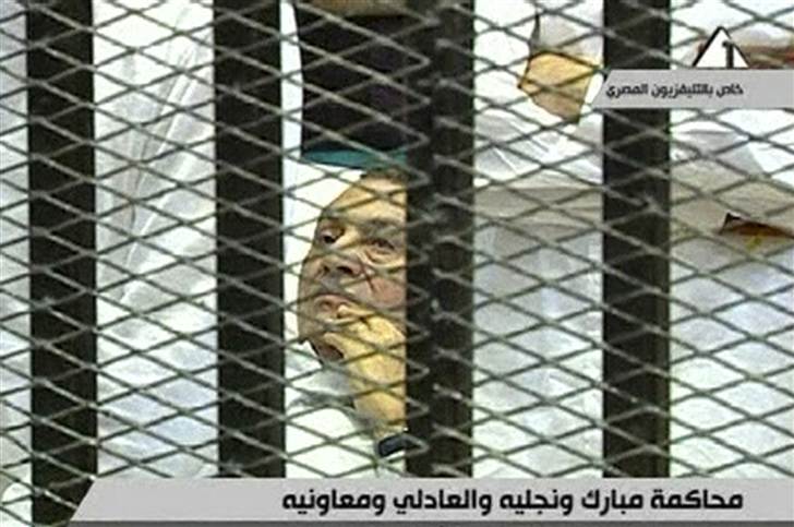 O Μουμπάρακ ήταν ξαπλωμένος σε φορείο μέσα σε ένα μεταλλικό κλουβί αρκετά μεγάλο καθώς μαζί του δικάζονται οι δυο του γιοι, Αλάα και Γκαμάλ, ο πρώην υπουργός Εσωτερικών Χαμπίμπ αλ-Άντλι και έξι ανώτεροι αξιωματικοί της αστυνομίας.
