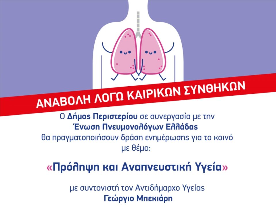 Λόγω δυσμενών καιρικών συνθηκών αναβάλλεται η προγραμματισμένη δράση ενημέρωσης για το κοινό με θέμα: «Πρόληψη και Αναπνευστική Υγεία», για την Πέμπτη 14 Νοεμβρίου 2024, ώρες 16.00 – 18.00, στην Πλατεία Δημαρχείου – Στάση Μετρό “Περιστέρι”, στο πλαίσιο της συνεργασίας του Δήμου Περιστερίου με την Ένωση Πνευμονολόγων Ελλάδας.