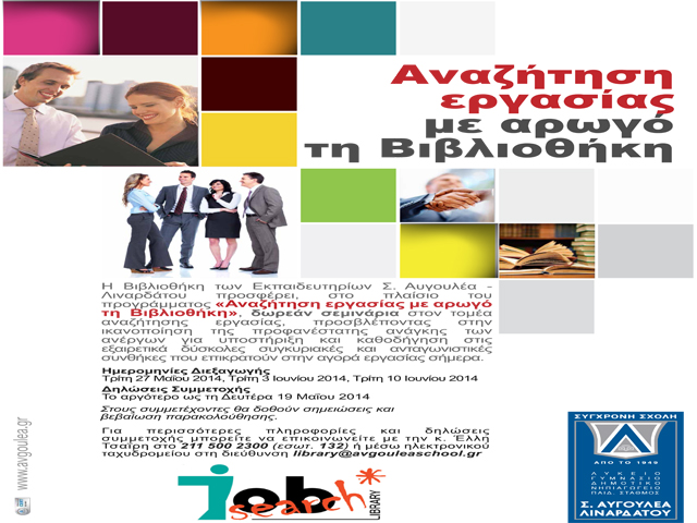 Η Βιβλιοθήκη των Εκπαιδευτηρίων Σ. Αυγουλέα-Λιναρδάτου προσφέρει, στο πλαίσιο του προγράμματος «Αναζήτηση εργασίας με αρωγό τη Βιβλιοθήκη», δωρεάν σεμινάρια στον τομέα αναζήτησης εργασίας, προσβλέποντας στην ικανοποίηση της προφανέστατης ανάγκης των ανέργων για υποστήριξη και καθοδήγηση στις εξαιρετικά δύσκολες συγκυριακές και ανταγωνιστικές συνθήκες που επικρατούν στην αγορά εργασίας σήμερα.