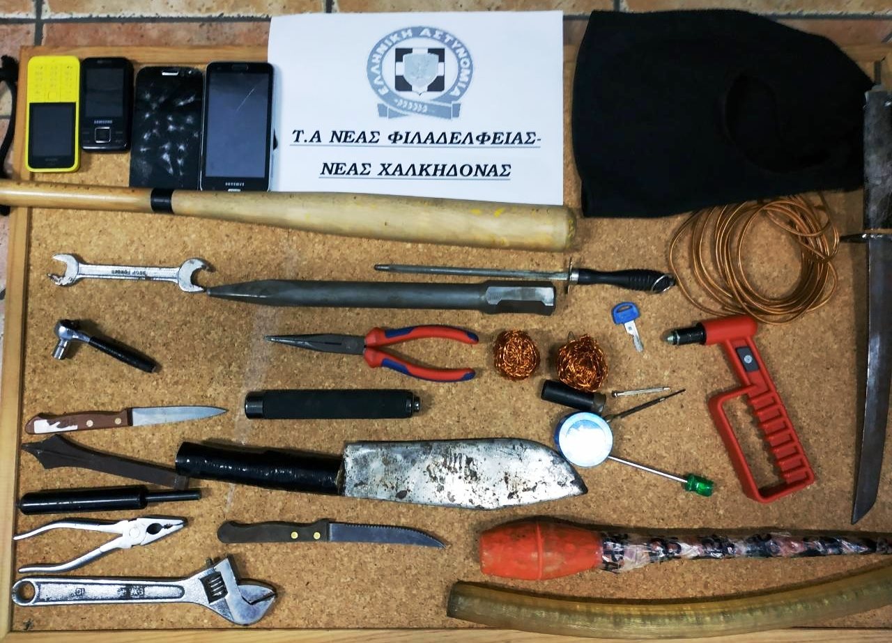 Από τις κατ’ οίκον έρευνες, βρέθηκαν και κατασχέθηκαν πλήθος κινητών τηλεφώνων, ηχείων και ηχοσυστημάτων, διαρρηκτικά εργαλεία, τρία μαχαίρια, κουκούλες και γάντια.