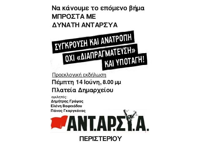 Η ΑΝΤΑΡΣΥΑ Περιστερίου προσκαλεί όλους τους εργαζόμενους/ες, τη νεολαία, τους αγωνιστές του κινήματος και της αριστεράς, στην ανοιχτή συγκέντρωση – εκδήλωση που θα πραγματοποιήσει την Πέμπτη 14 Ιουνίου στις 8μμ στην πλ. Δημαρχείου με θέμα:
