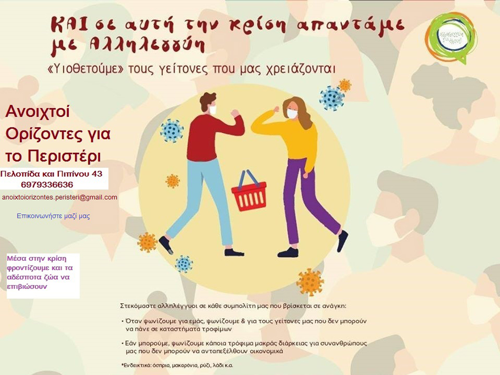 Στο κεντρικό τους μήνυμα οι «Ανοιχτοί Ορίζοντες» αναφέρουν: ΚΑΙ σε αυτή την κρίση απαντάμε με Αλληλεγγύη, «Υιοθετούμε» τους γείτονες που μας χρειάζονται.