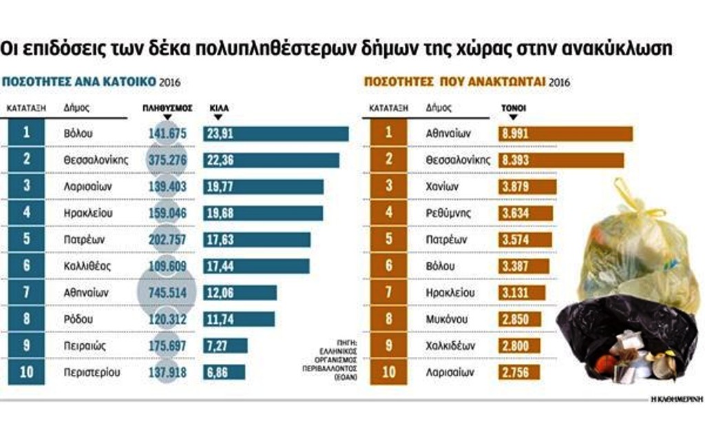 Στον παρακάτω πίνακα του Ελληνικού Οργανισμού Ανακύκλωσης (ΕΟΑΝ) που δημοσίευσε η εφημερίδα Καθημερινή, φαίνεται καθαρά ότι ο Δήμος μας είναι στην τελευταία θέση των επιδόσεων στην ανακύκλωση, από τους δέκα πολυπληθέστερους δήμους.