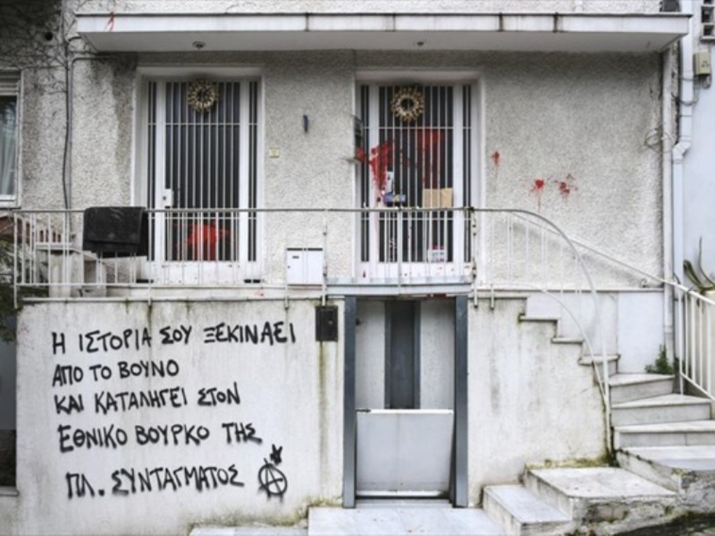 Οι άγνωστοι πέταξαν μπογιές στην είσοδο του σπιτιού και έγραψαν το σύνθημα: «Η ιστορία σου ξεκινάει από το βουνό και καταλήγει στον εθνικό βούρκο της πλατείας Συντάγματος», υπογράφοντάς το με το χαρακτηριστικό σύμβολο το οποίο χρησιμοποιούν αναρχικοί και αντιεξουσιαστές (Α σε κύκλο).