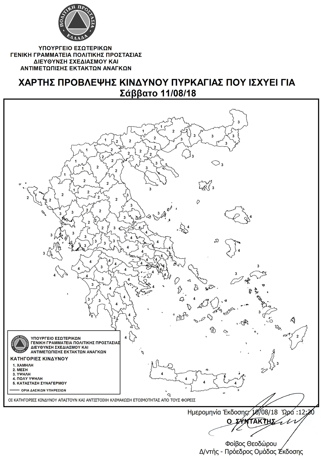 Απαγόρευση κυκλοφορίας οχημάτων και παραμονής εκδρομέων, για αύριο Σάββατο 11 Αυγούστου 2018, που ο «Χάρτης Πρόβλεψης Κινδύνου Πυρκαγιάς» της Γενικής Γραμματείας Πολιτικής Προστασίας αναφέρει πρόβλεψη κατηγορίας κινδύνου 4 (πολύ υψηλός κίνδυνος πυρκαγιάς).