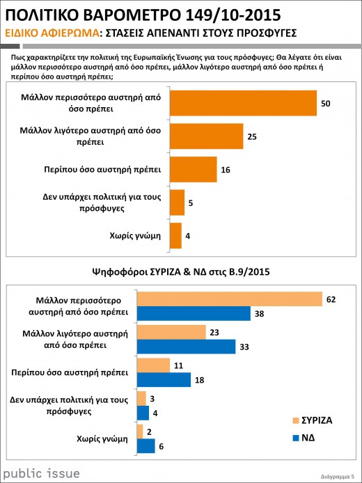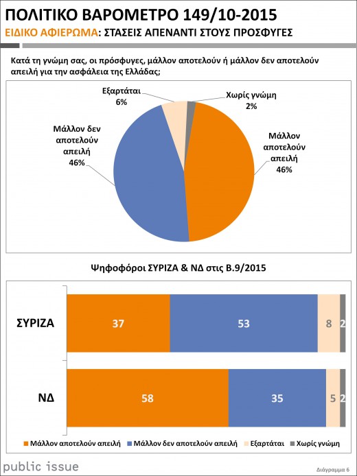 Ένας στους δύο Έλληνες (ποσοστό 46%) θεωρεί πως οι πρόσφυγες μάλλον αποτελούν απειλή για την ασφάλεια της χώρας σύμφωνα με έρευνα της Public Issue για λογαριασμό της Αυγής της Κυριακής.