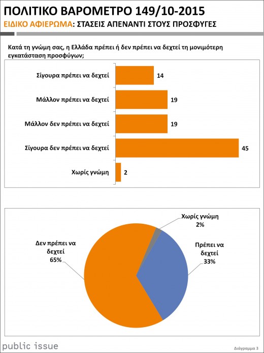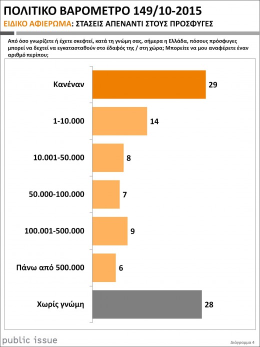 Το ίδιο ακριβώς ποσοστό δήλωσε το αντίθετο ενώ σε άλλη ερώτηση προέκυψε πως η πλειοψηφία δεν επιθυμεί η Ελλάδα να δεχθεί μόνιμη εγκατάσταση προσφύγων στο έδαφός της και πως δεν έχει τη δυνατότητα για κάτι τέτοιο.