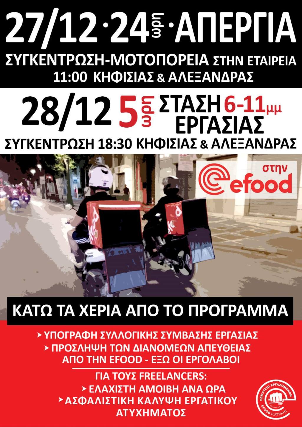 Το Σωματείο Εργαζομένων Efood Ν. Αττικής, απαιτεί την υπογραφή Συλλογικής Σύμβασης Εργασίας με ουσιαστικές αυξήσεις στους μισθούς για όλους, πρόσληψη διανομέων απευθείας από την Efood και όχι από τους εργολάβους και για τους freelancers ελάχιστη αμοιβή ανά ώρα και ασφαλιστική κάλυψη εργατικού ατυχήματος. Ζητά επίσης να διασφαλιστούν μέτρα υγείας και ασφάλειας για όλους και να δοθεί ο προσωπικός εξοπλισμός δωρεάν σε freelancers και μισθωτούς, όπως προβλέπει η νομοθεσία, να δοθούν επιδόματα ανθυγιεινής εργασίας, γάμου και ακουστικού (για αυτούς που δουλεύουν στα τηλεφωνικά κέντρα).