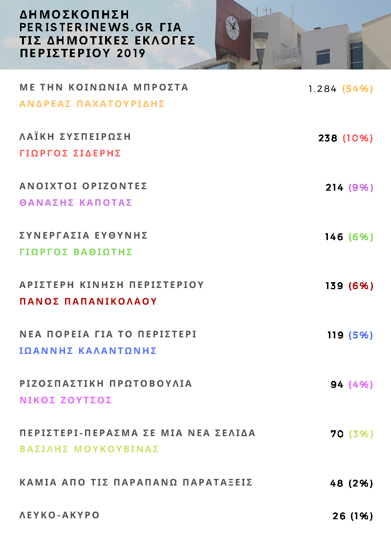 Μεγάλο ποσοστό αποδοχής απέσπασε ο Δήμαρχος Περιστερίου Ανδρέας Παχατουρίδης συγκεντρώνοντας ποσοστό 54% ενώ η Λαϊκή Συσπείρωση Περιστερίου με νέο επικεφαλής τον Γιώργο Σιδέρη κατέλαβε τη δεύτερη θέση με 10%.